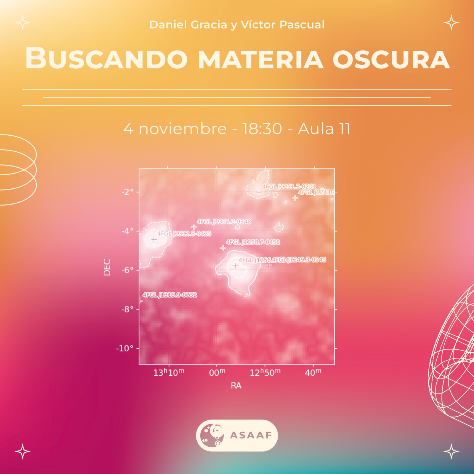 Nuestro secretario Víctor y su amigo Daniel se conocieron en una escuela de física de partículas y cosmología y decidieron aventurarse para impartir esta curiosa charla. Aprenderemos qué evidencias tenemos sobre la existencia de la materia oscura y cómo los físicos tratan de dar con ella.